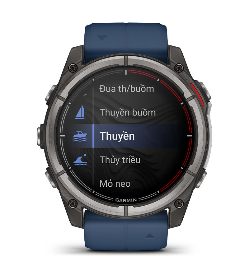 Tính Năng Hàng Hải Tiên Tiến: Garmin Quatix 8 AMOLED mang đến sự kết nối toàn diện với hệ thống thiết bị marine của Garmin. Bạn có thể điều khiển chartplotter tương thích qua kết nối Bluetooth với lệnh thoại, cho phép thay đổi hướng đi hoặc xem dữ liệu mà không cần rời tay lái. Truyền dữ liệu thuyền thời gian thực, bao gồm hướng đi, tốc độ và độ sâu nước, giúp bạn luôn nắm bắt tình hình. Ngoài ra, đồng hồ hỗ trợ điều khiển từ xa autopilot, động cơ trolling Force, hệ thống âm thanh Fusion và nhiều thiết bị khác. Cảnh báo neo thông minh sẽ thông báo về thay đổi thủy triều hoặc neo trôi, đảm bảo an toàn cho chuyến đi. Đối với hoạt động chèo thuyền, các tính năng như hỗ trợ tack, hướng dẫn khởi đầu cuộc đua và đồng hồ regatta sẽ giúp bạn chinh phục mọi cuộc thi. Ứng dụng câu cá cung cấp dự báo cá và dữ liệu thủy triều, tối ưu hóa thời gian ra khơi.